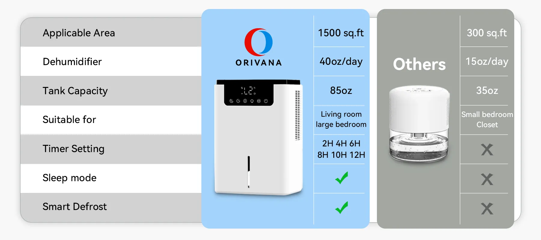 Orivana dual-core powerful dehumidification technology uses two independent dehumidification systems for double the efficiency. This means whether it's the rainy season or stubborn dampness, it quickly removes moisture from the air, banishing stickiness and musty odors for a home that's instantly fresh and dry.