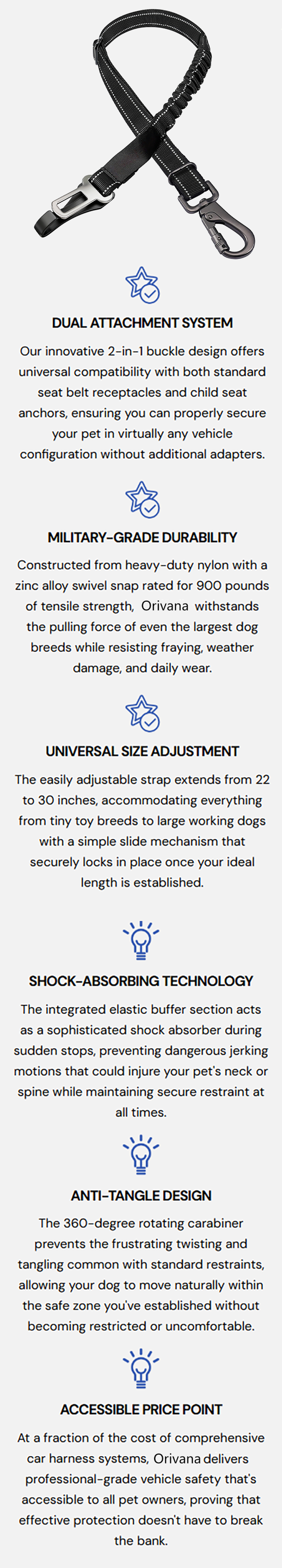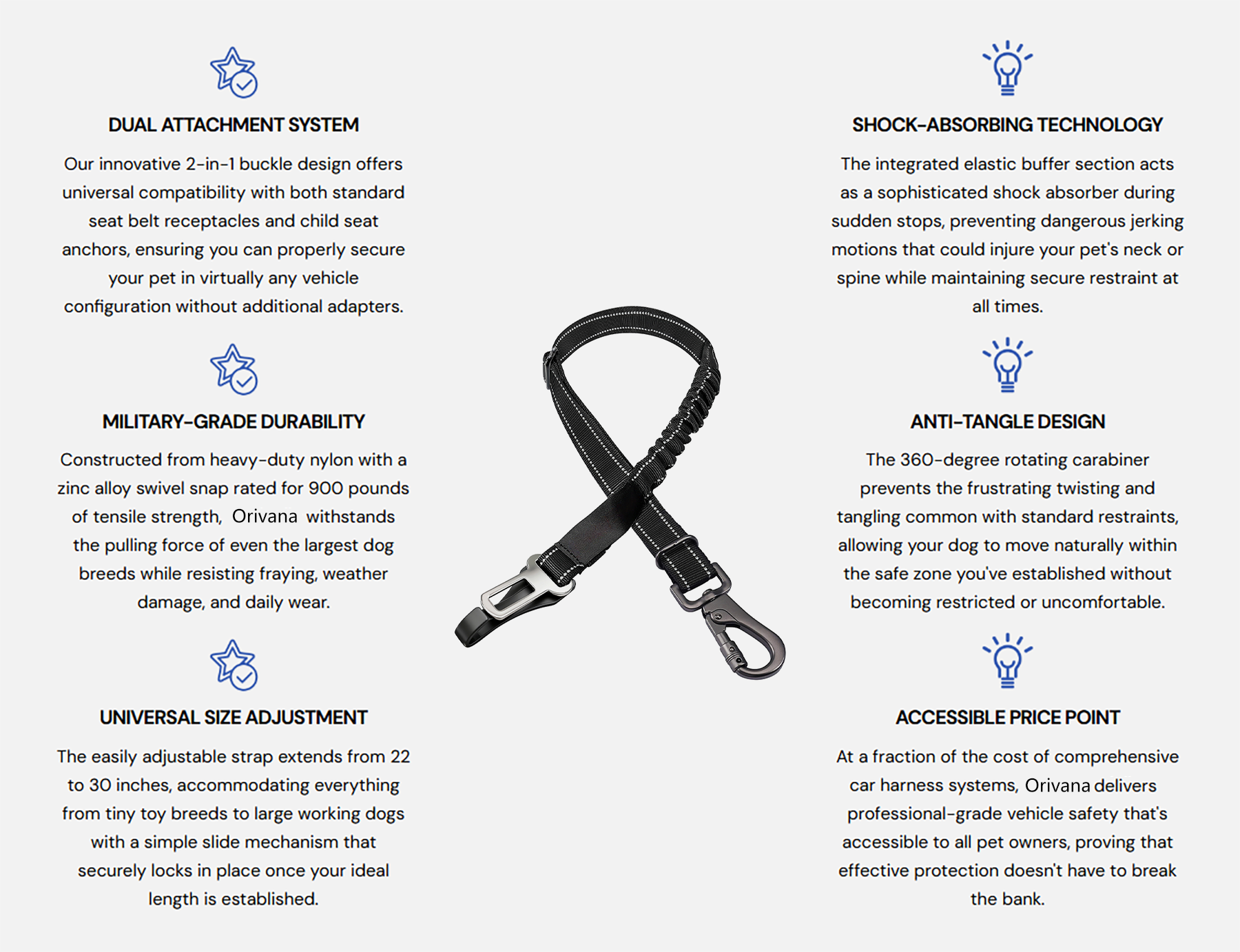The Orivana Multi-Functional Universal Pet Safety Harness is the ultimate solution you’ve been looking for! We understand the need for both safety and convenience, which is why we created a truly "all-in-one" restraint device.